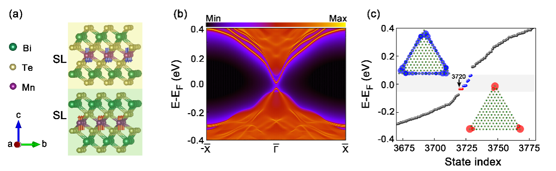 图2:第一性原理计算材料候选。(a)双层 MnBi2Te4晶体和磁结构、(b)一维纳米带能带结构和(c)三角纳米盘的能量本征谱。