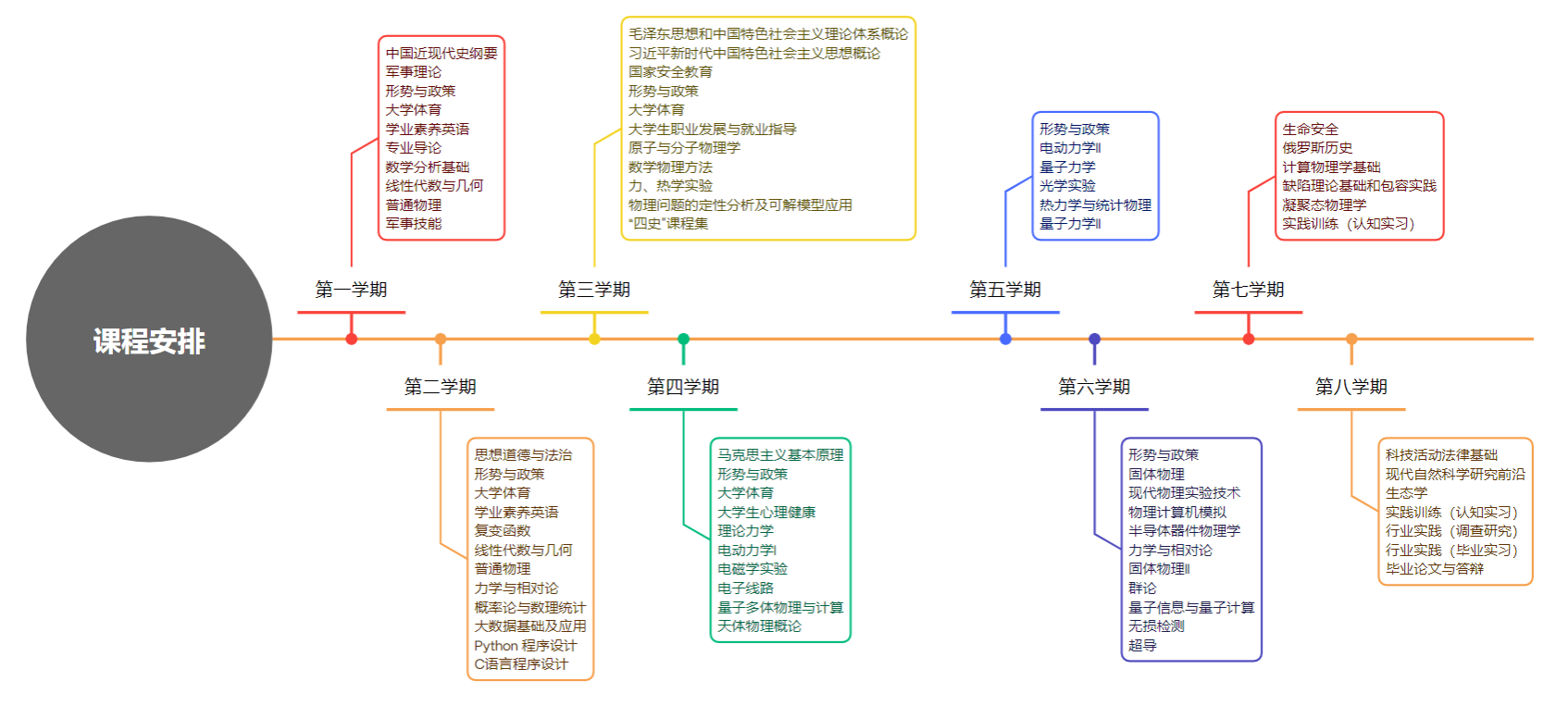 专业导论,复变函数,数学分析基础,线性代数与几何,普通物理,原子与分子物理学,数学物理方法,力、热学实验,理论力学,电动力学,电磁学实验,量子力学,光学实验,计算物理学基础,热力学与统计物理,固体物理,近现代物理实验技术,物理计算机模拟,半导体器件物理学,力学与相对论,凝聚态物理。